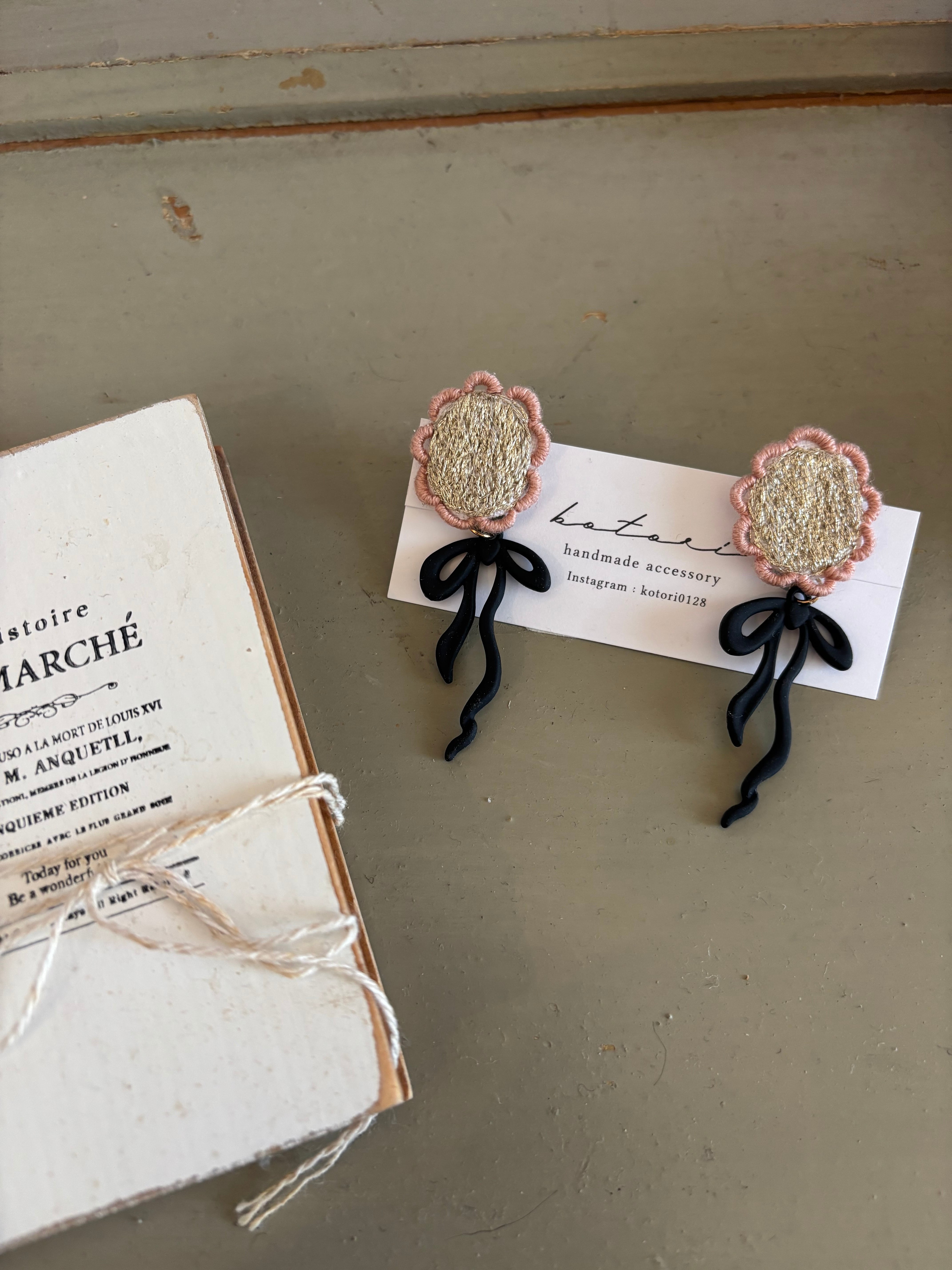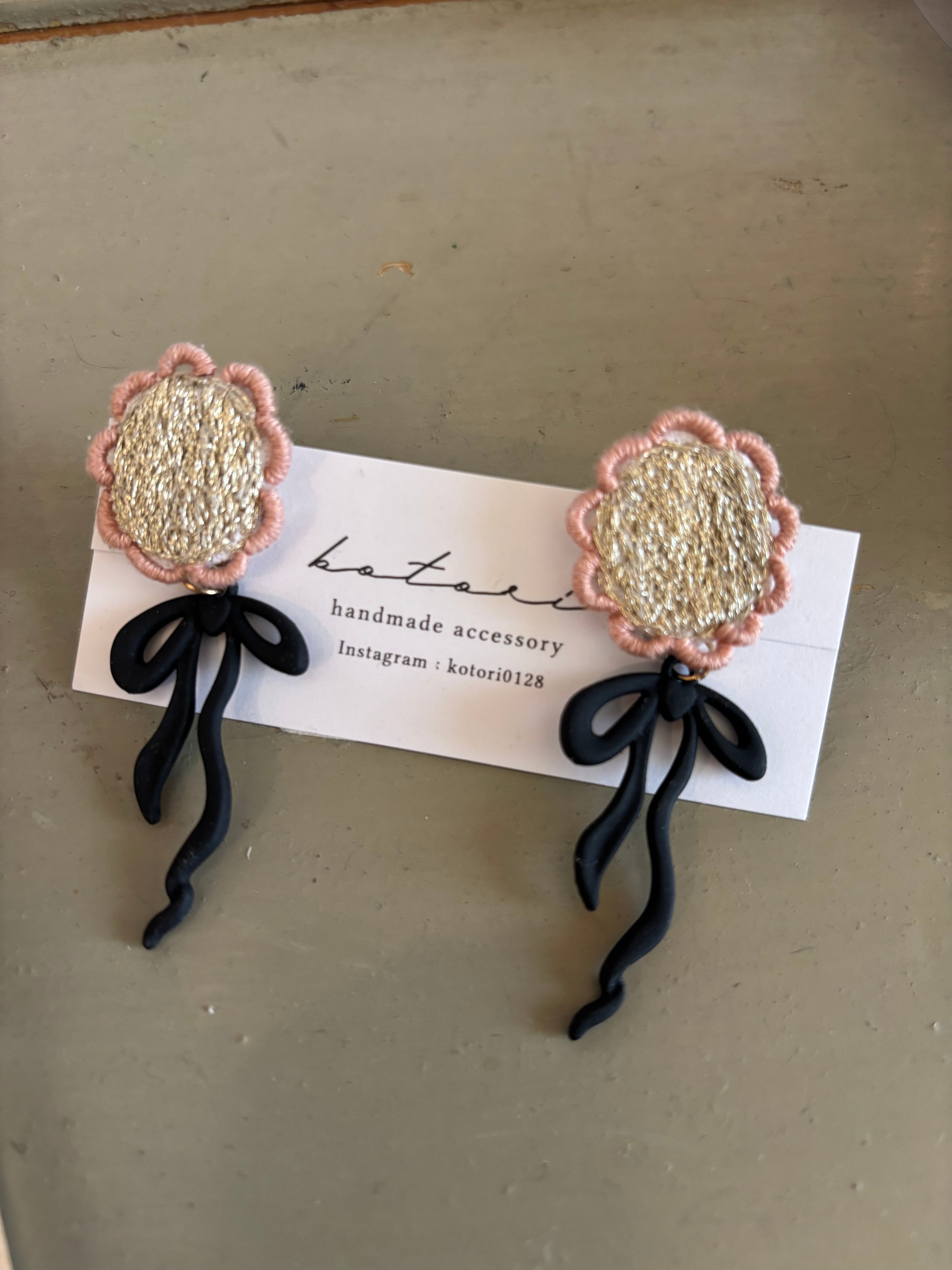 kotori ゴールド刺繍とリボンチャームイヤリング