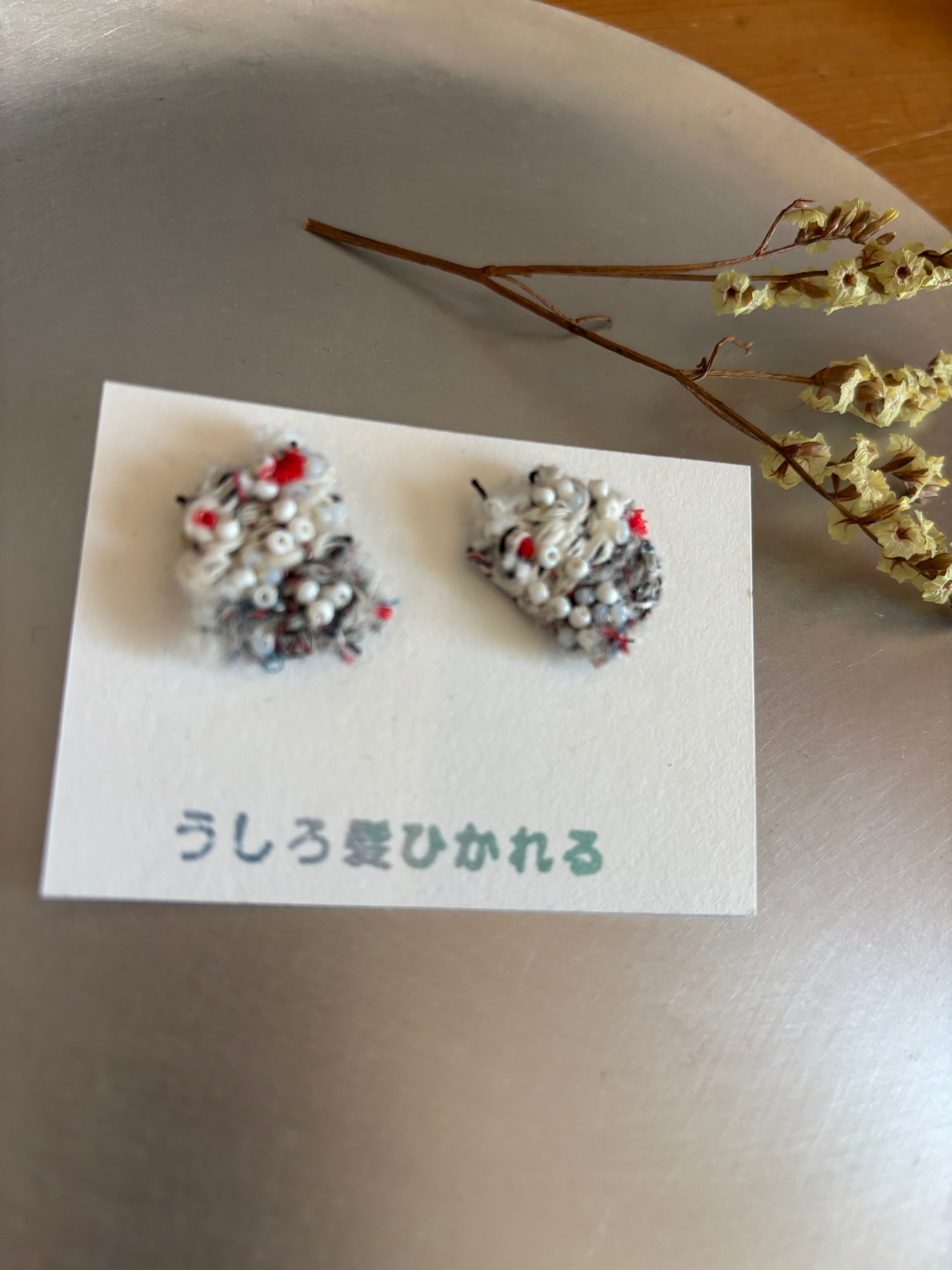 フランスアンティークビーズとランダムな刺繍で仕上げられたピアス。上品もありつつ、どこかいびつで心惹かれてしまいます。
