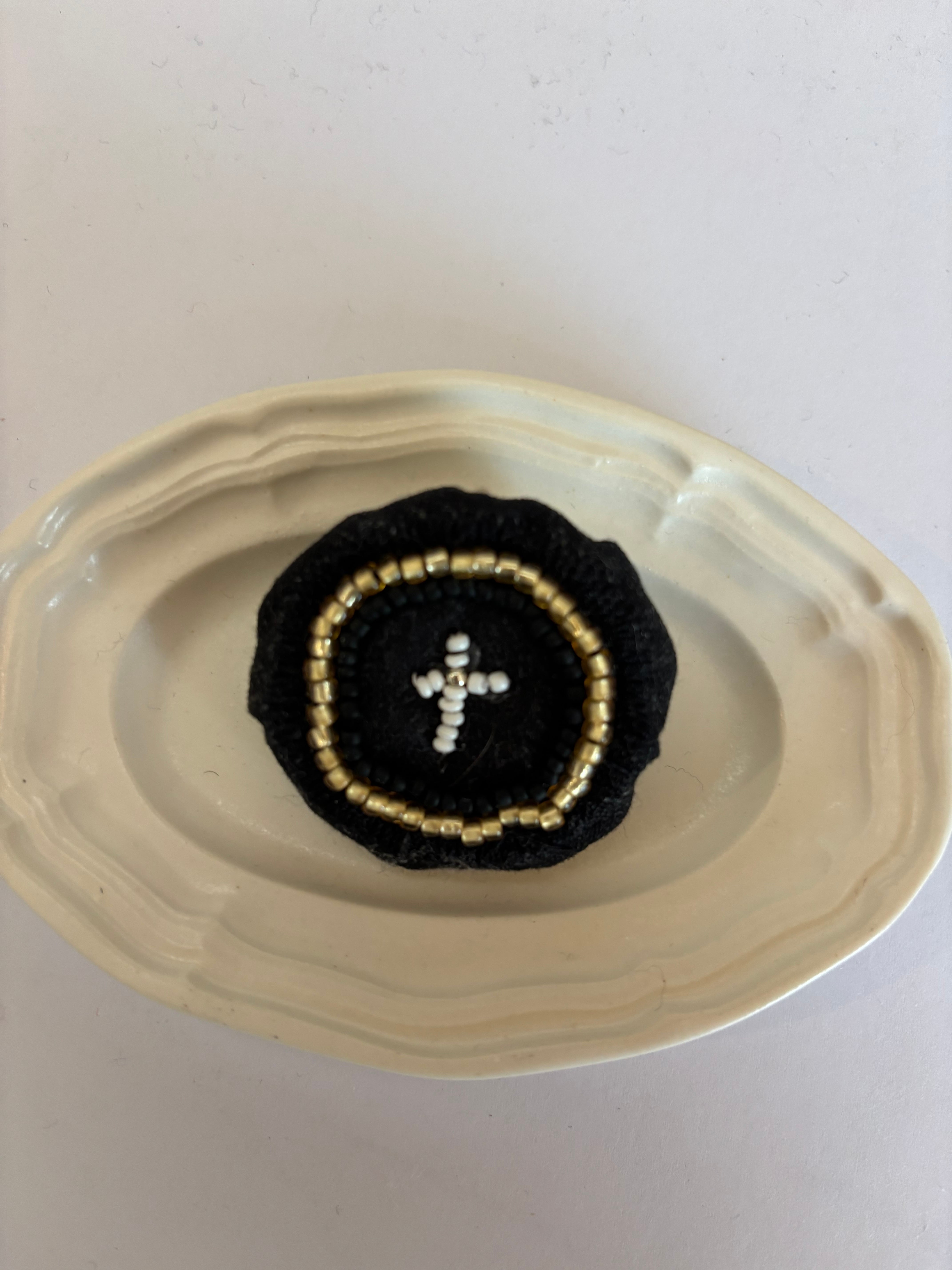 ビーズや刺繍を施したちょっぴりいびつで、それでいて素敵要素満載のブローチ。