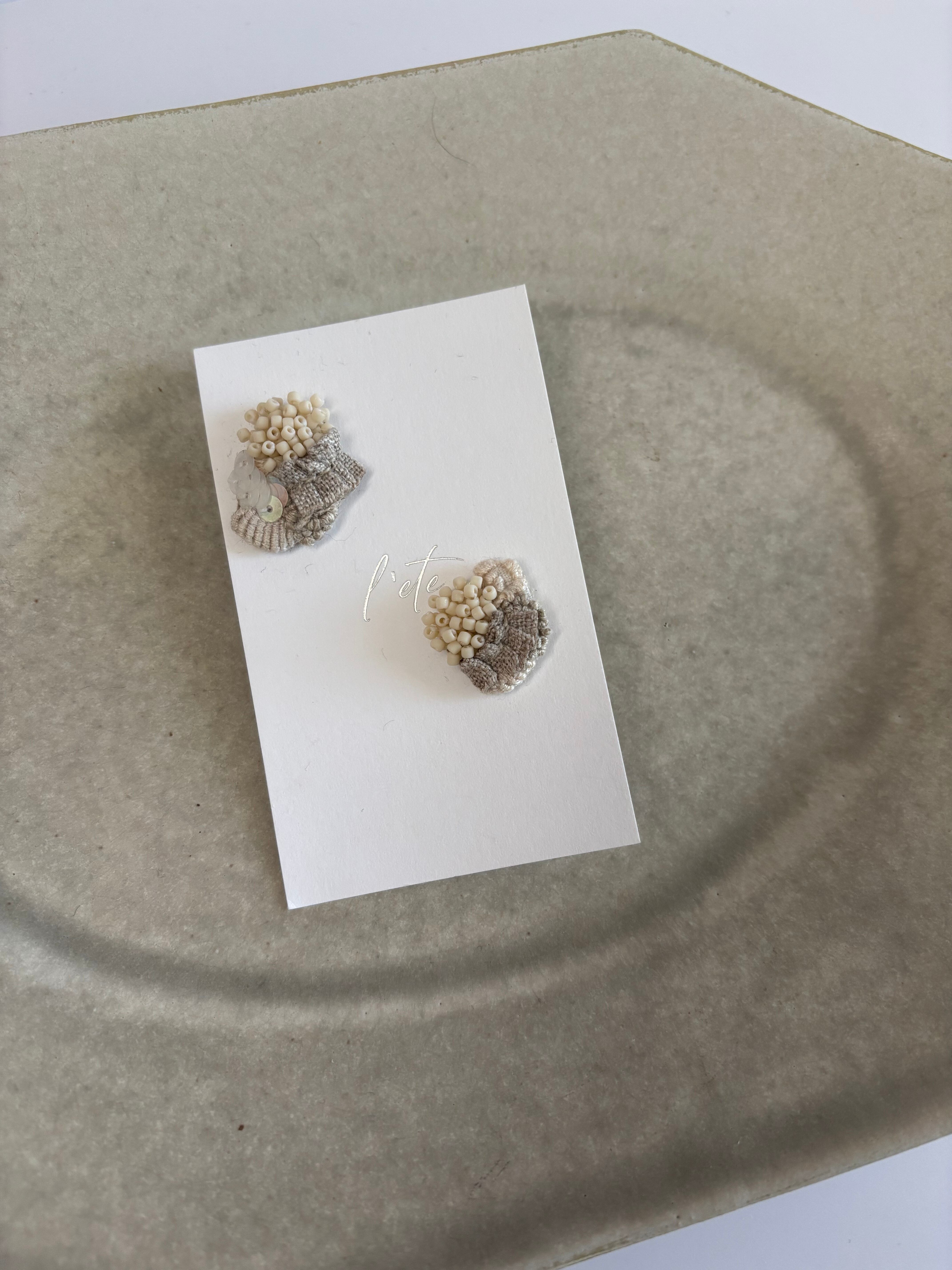 ビーズや刺繍がアシンメトリーに施されているアクセサリー。角度によって表情が変わりとても素敵です。