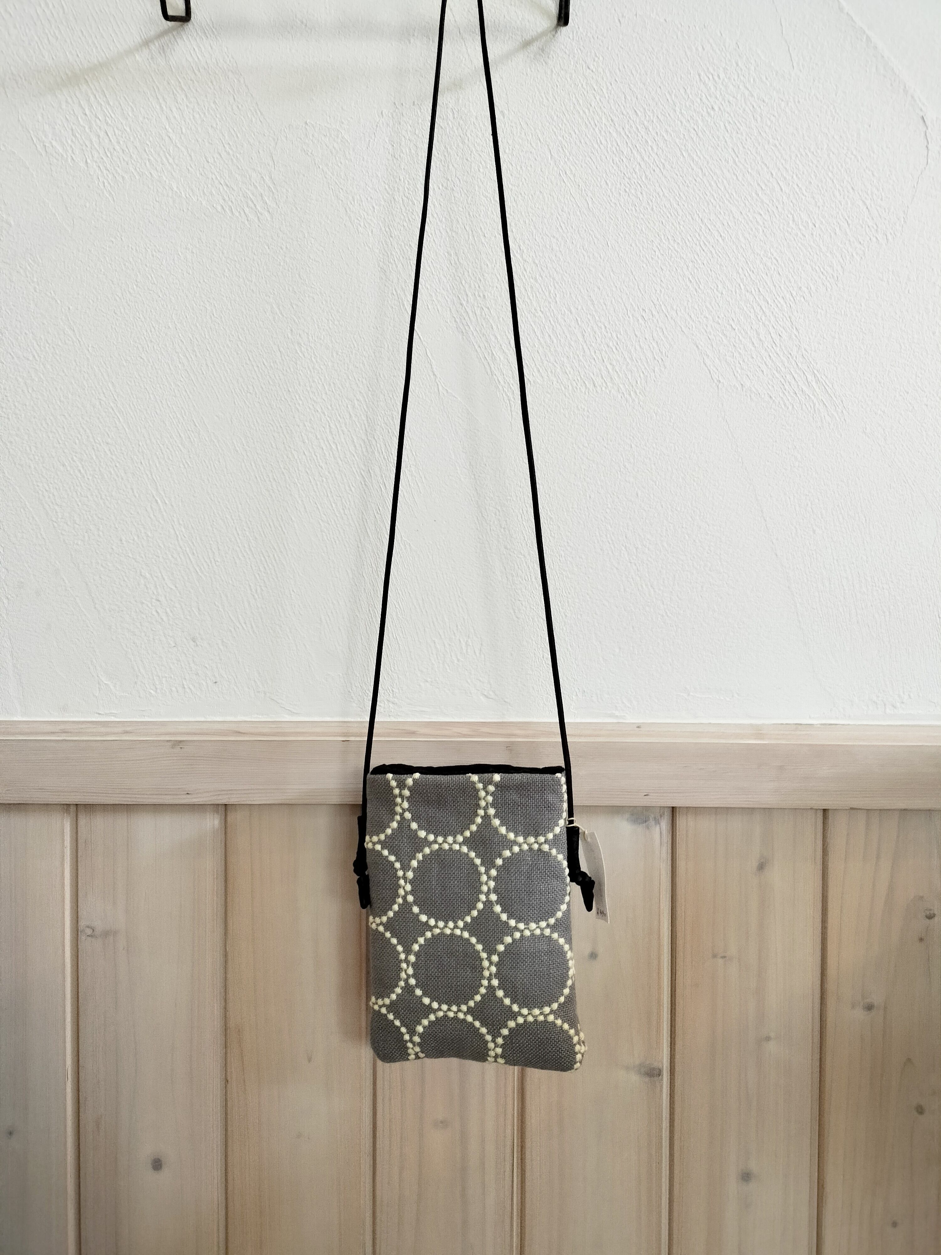 ミナペルホネンのタンバリン(グレー)を使い丁寧に作られたスマホショルダー。ボタンなどもついていないので、さっと取り出せて使い勝手も良さそう♩