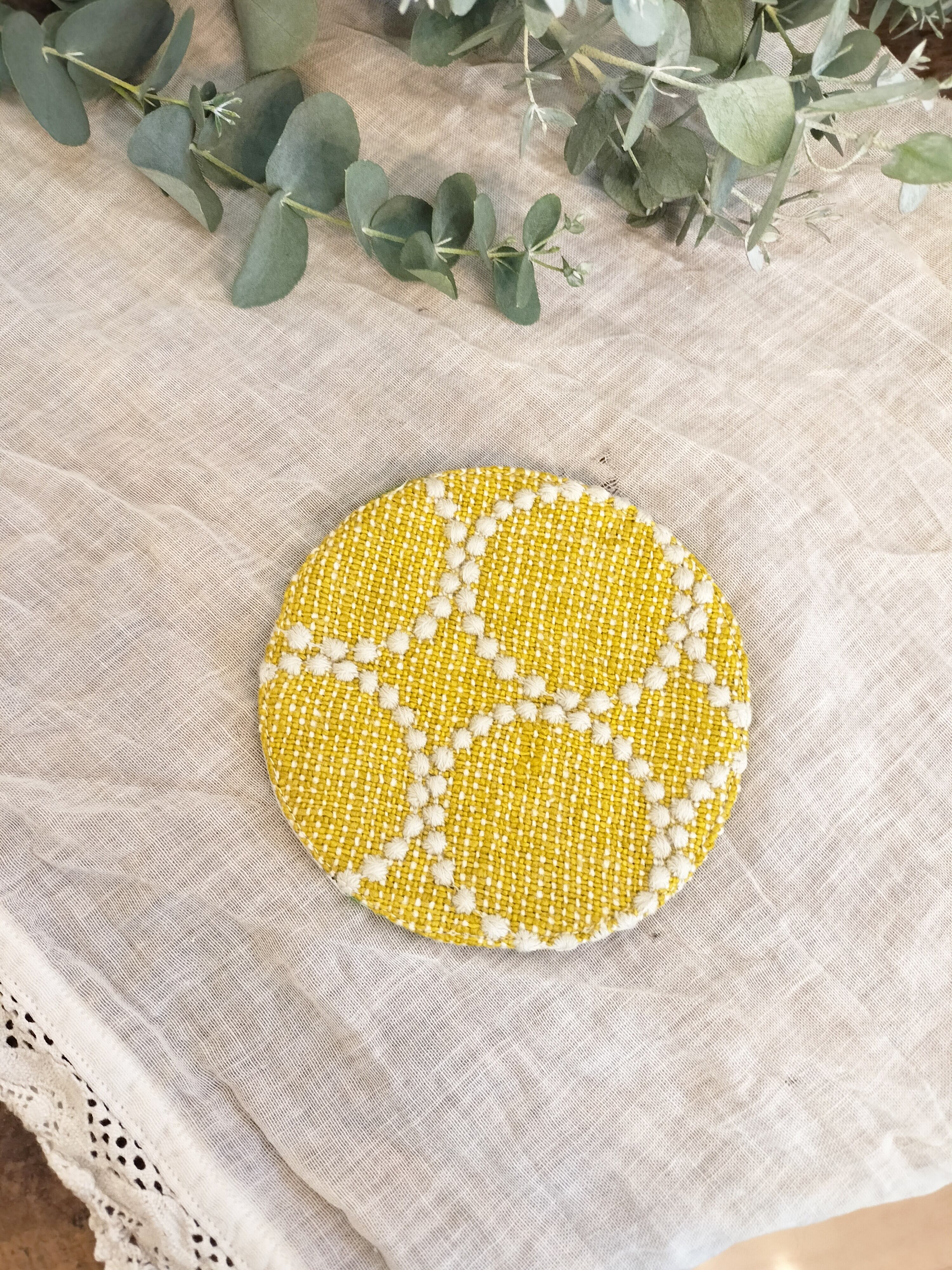 itoiro doriさんのミナペルホネンのファブリックを使ったまんまるコースター。表裏柄が違うので