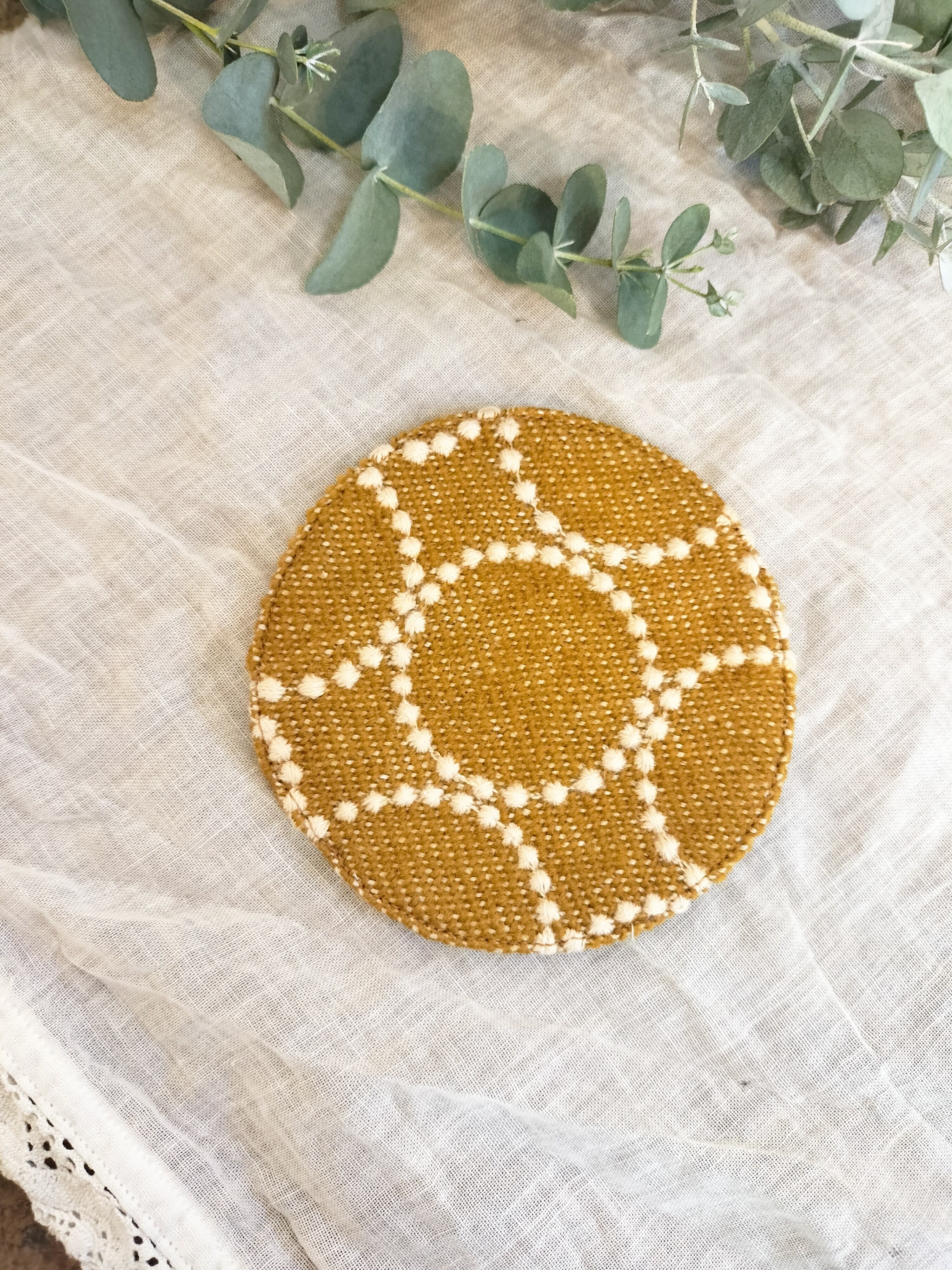 itoiro doriさんのミナペルホネンのファブリックを使ったまんまるコースター。表裏柄が違うので