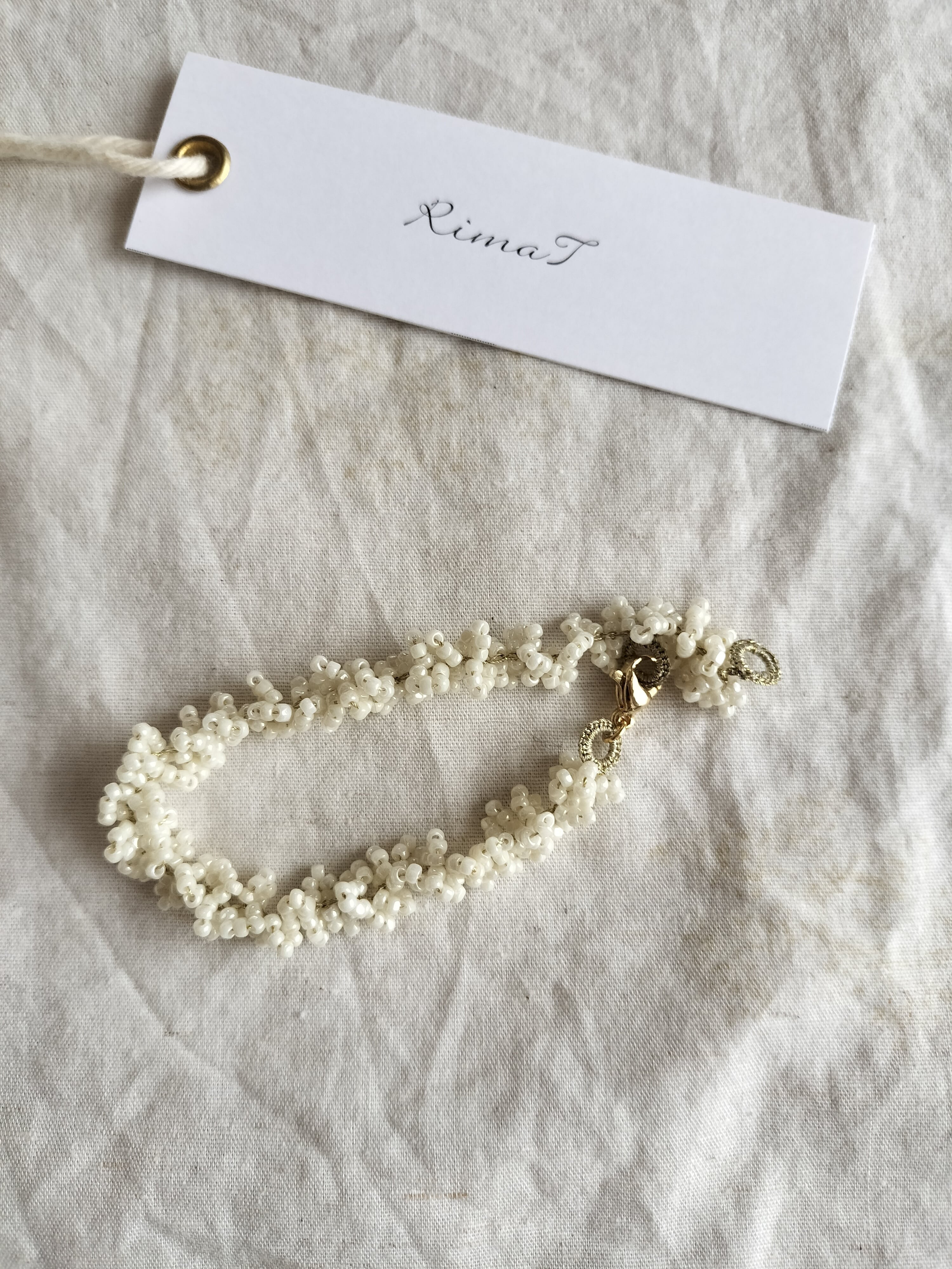 細部まで拘って編まれたビーズブレスレット。とても軽く、ふんわりとしたイメージがひつじ雲のよう。