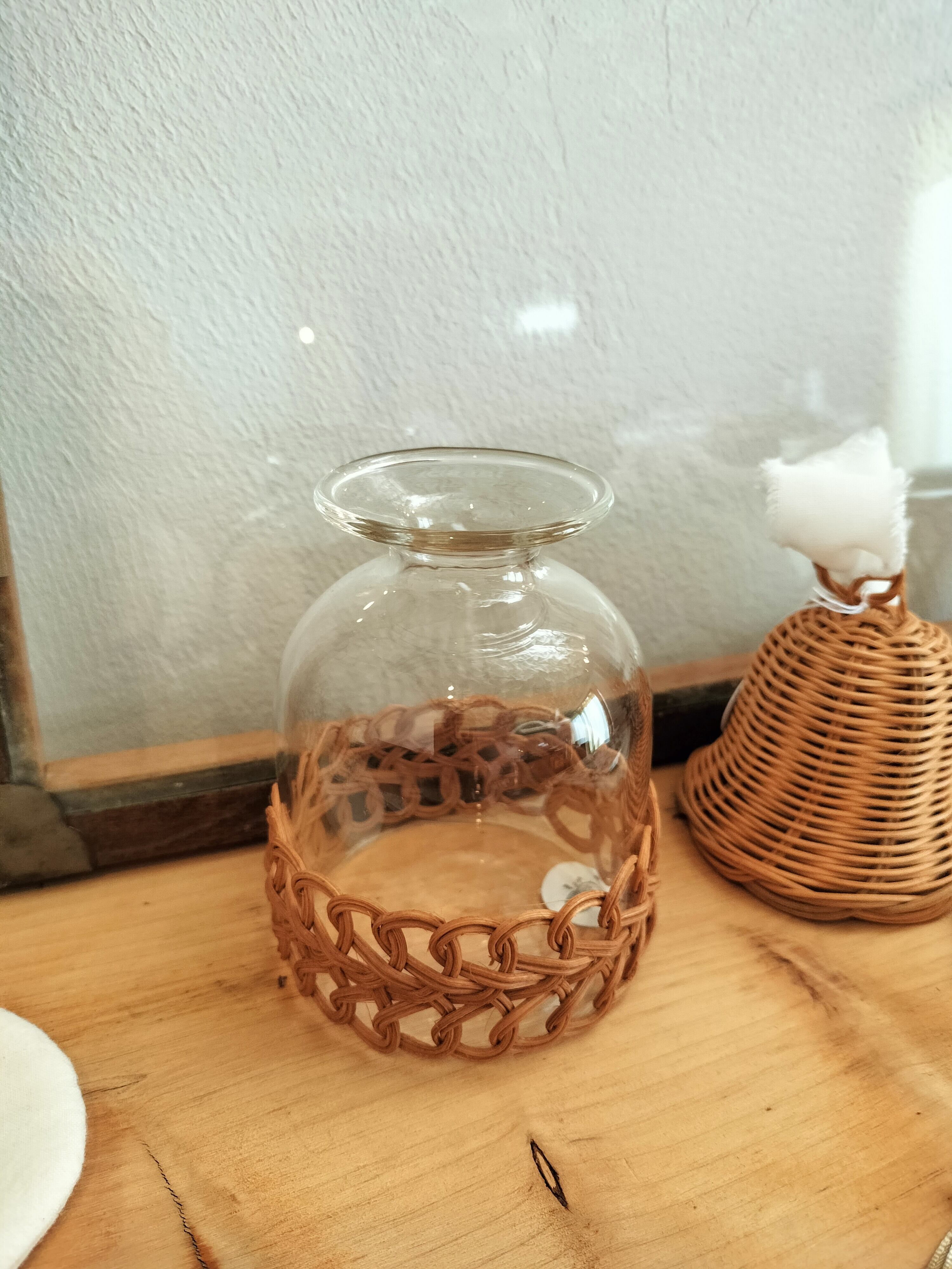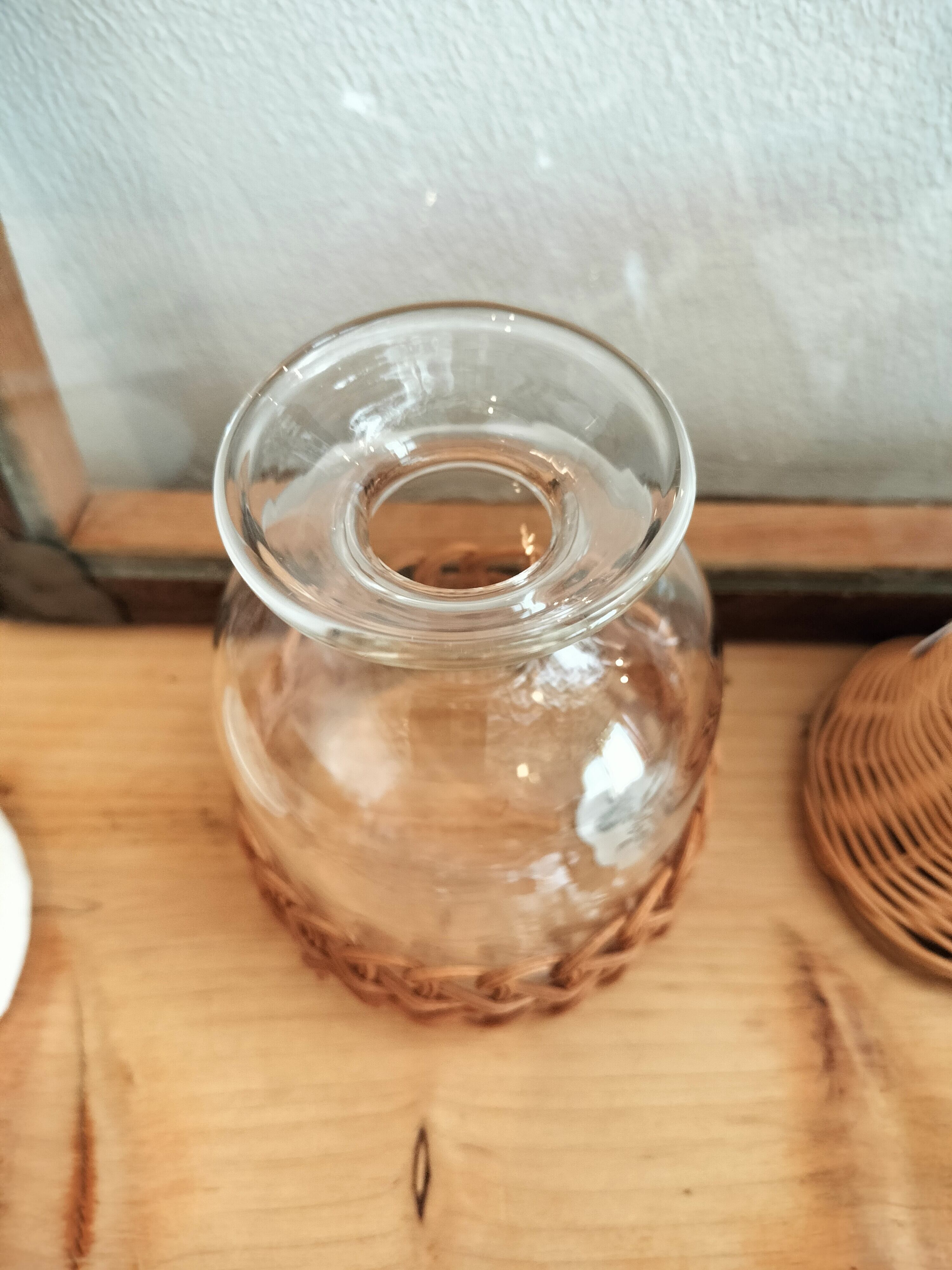優しい雰囲気を持った籐とガラスのコラボで、お花も引き立ちます。お気に入りのドライフラワーを飾っても。