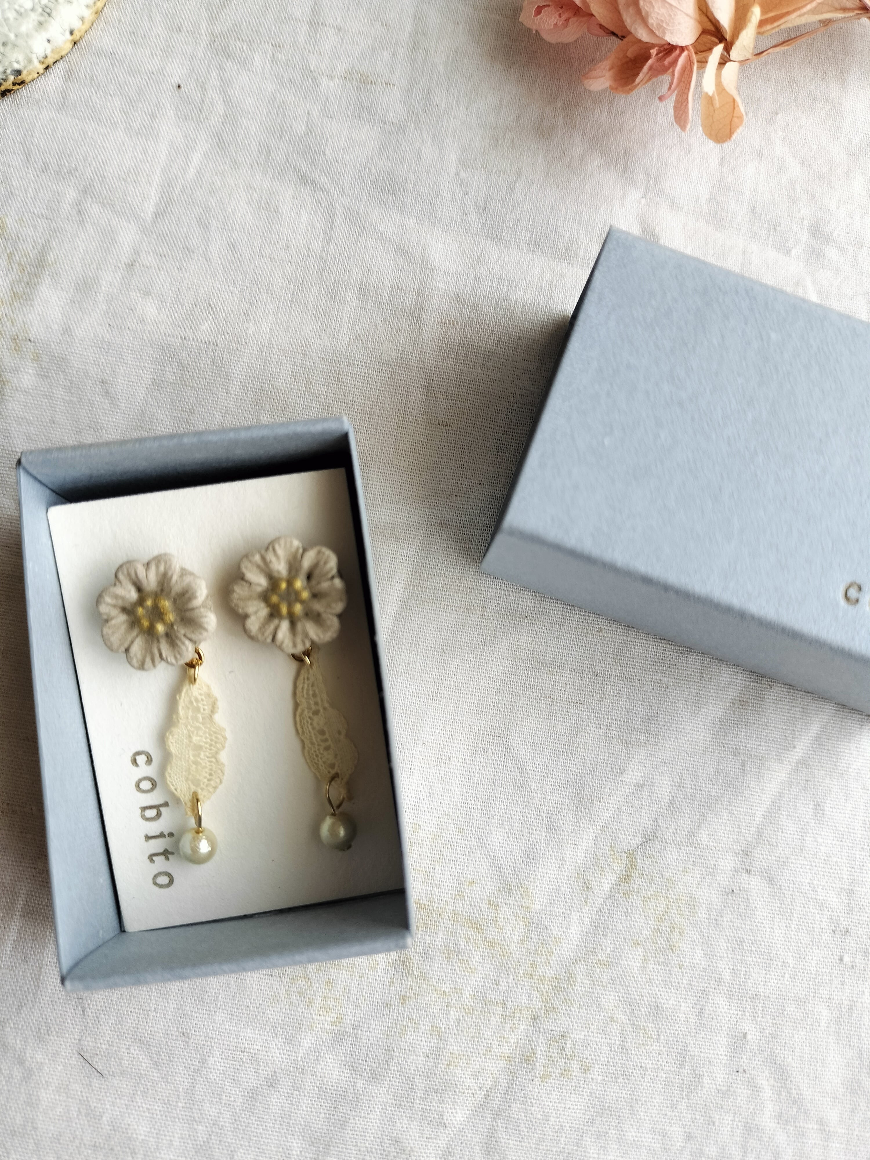 可愛いお花にレースとビーズの付いた、優しい雰囲気のイヤリング。さり気なく揺れるレースがとても可愛いのです。