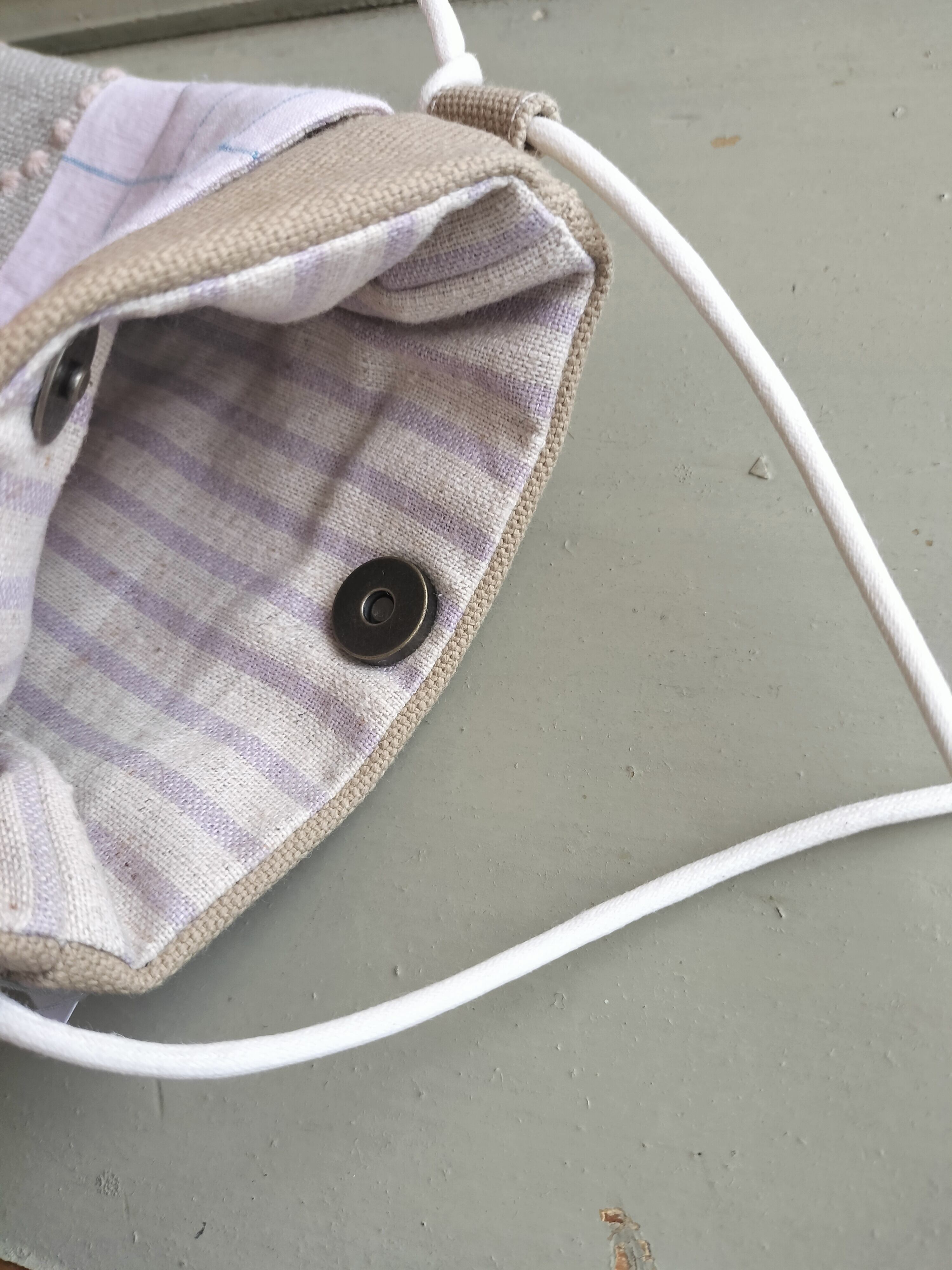 ミナペルホネンのファブリックでパッチワークを施したスマホポシェット。