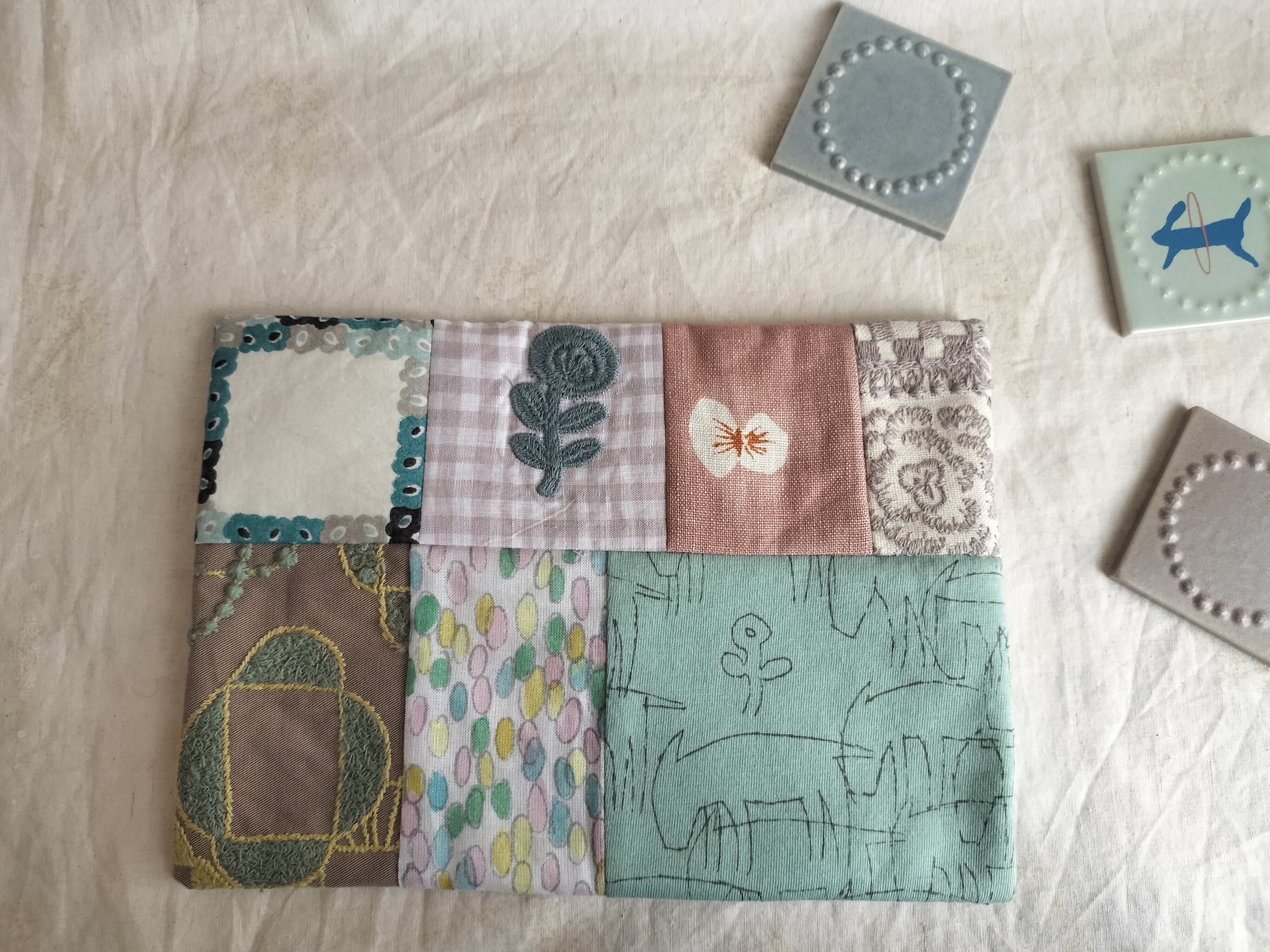 ミナペルホネンのファブリックを用いて作られたパッチワークのミニマット。おやつマットや、お気に入りの雑貨をディスプレイしたり、キャビネットに敷いてみたり。