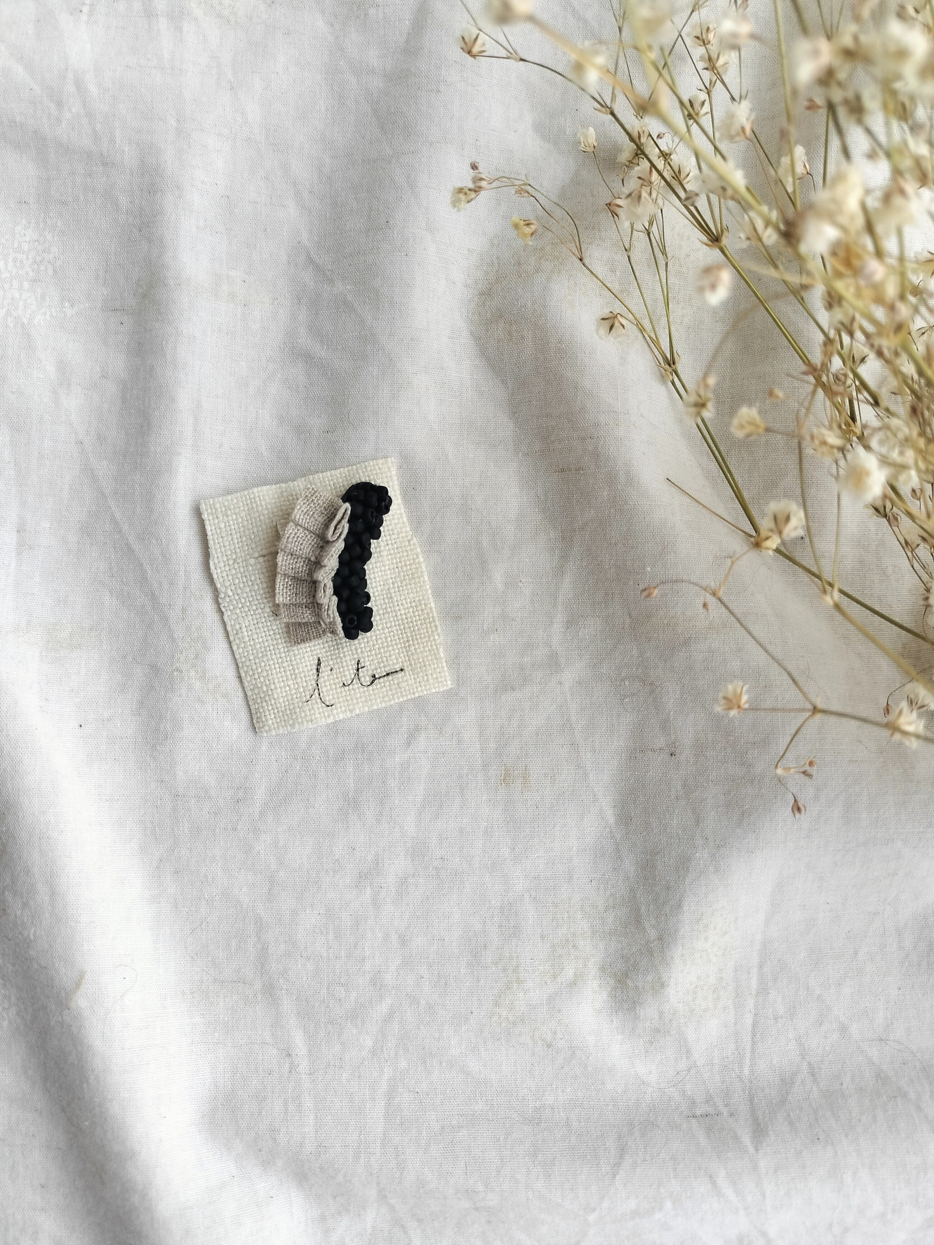 マットな黒ビーズとベージュのひらひらが可愛いイヤーカフ。大きめで存在感のあるイヤーカフですが、他のピアスやイヤリングとの重ね付けもとても素敵な雰囲気になります。