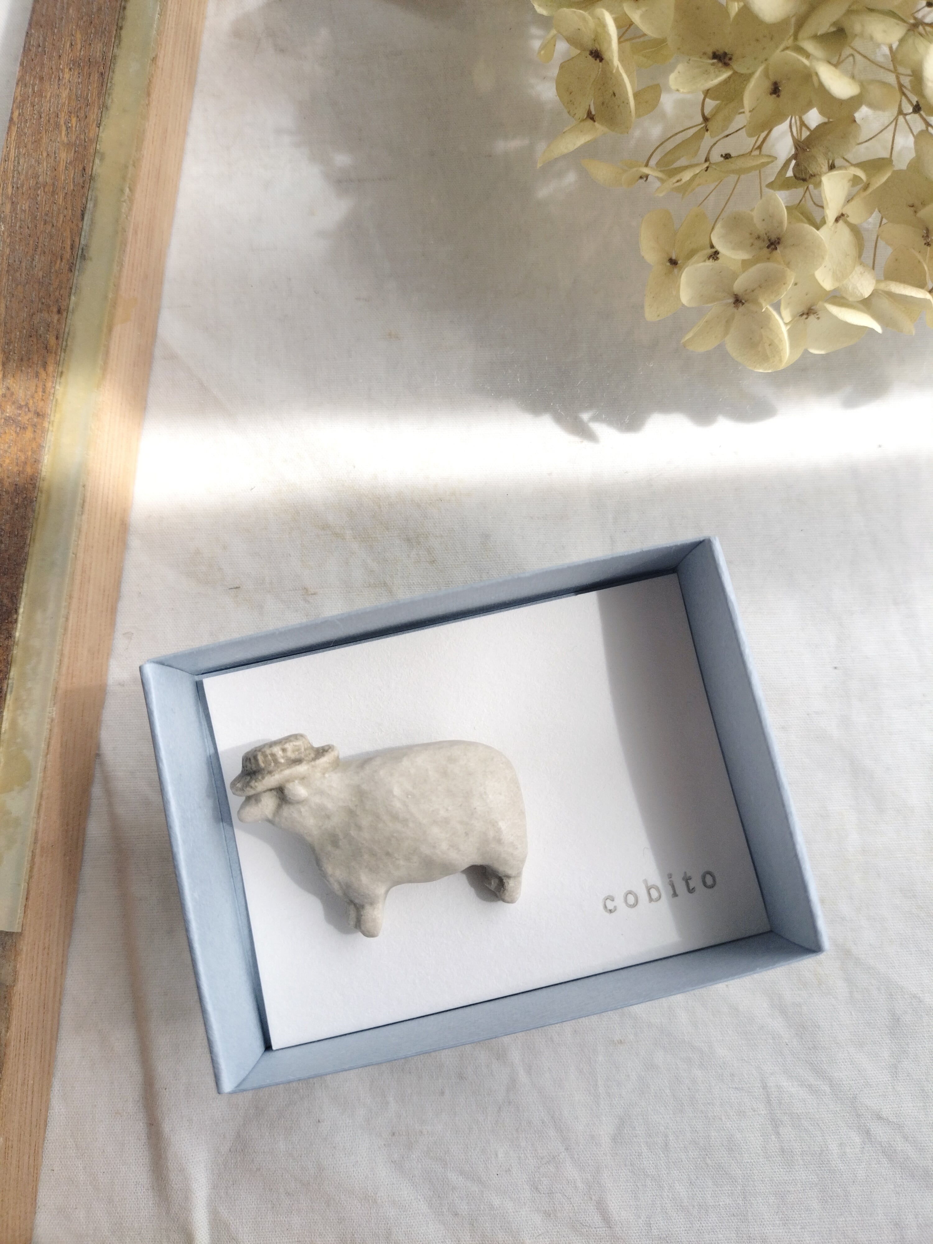 帽子を被ったひつじのブローチ。なんだか物語にでてくるようなブローチです。細部まで可愛らしいひつじさんを表現しています。