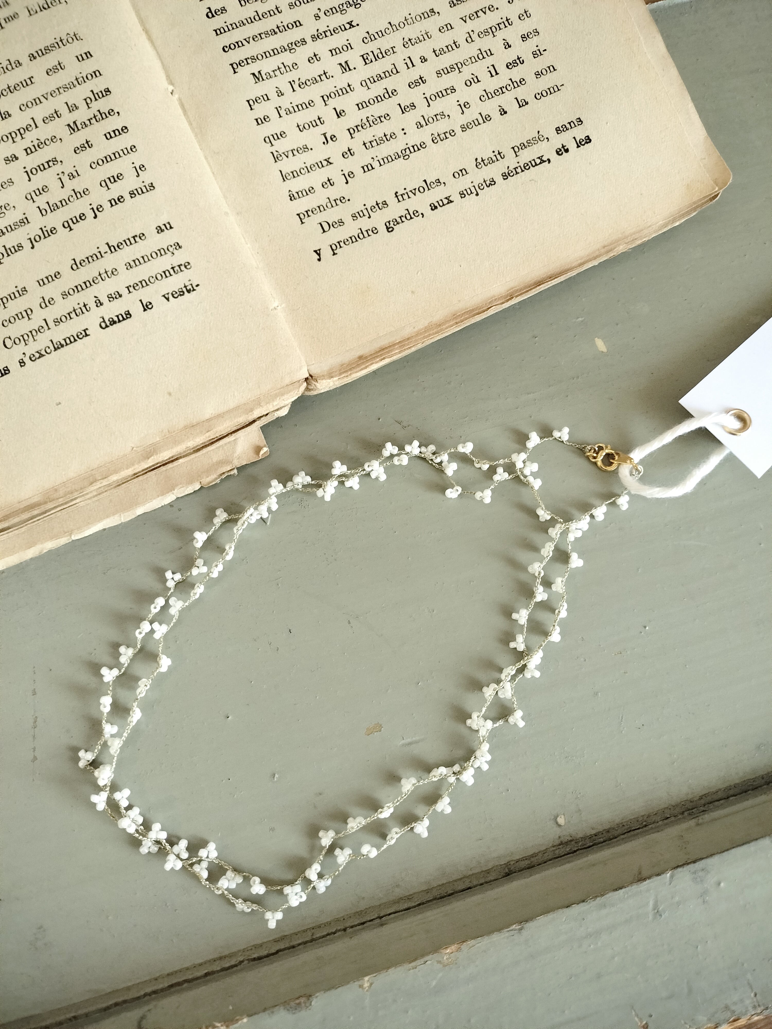 ビーズとゴールドの糸が目を引く素敵なブレスレット。広げるとネックレスとしてもお使いいただけます。